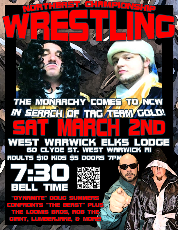 The West Warwick Elks Lodge is located at 60 Clyde Street in West Warwick, RI. Doors open at 7pm with a special 7:40pm start time for the wrestling action to begin. Tickets are only $10 at the door for adults and only $5 for all kids twelve and under. For up to date information on Northeast Championship Wrestling be sure to visit us online at http://thencw.com and like us on Facebook at http://www.facebook.com/NCWwrestling.
