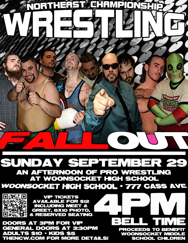 WOONSOCKET– Northeast Championship Wrestling’s 2013 season continues with a huge benefit event at Woonsocket High School [777 Cass Avenue] on Sunday afternoon September 29th for NCW FALLOUT! Competing in a seasonal format from February through November, for sixteen years NCW has presented a unique night of entertainment for fans bringing forth our larger than life characters, dynamic storylines, and incredible athleticism all while providing a unique experience for fans of all ages.