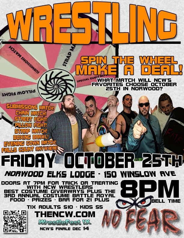 NORWOOD– On Friday night October 25th Northeast Championship Wrestling presents the penultimate event of the 2013 wrestling season when we return to the Elks Lodge [152 Winslow Avenue] in Norwood, MA for our annual Halloween spectacular NO FEAR! Competing in a seasonal format from February through December, for sixteen years NCW has presented a unique night of entertainment for fans bringing forth our larger than life characters, dynamic storylines, and incredible athleticism all while providing a unique experience for fans of all ages.
