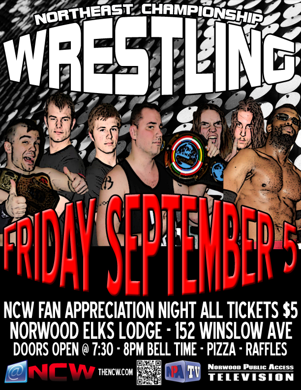 NORWOOD, MASSACHUSETTS– On Friday night September 5th Northeast Championship Wrestling’s 2014 Season continues when we return to the Elks Lodge in Norwood (152 Winslow Avenue) for NCW FALLOUT, our NCW Fan Appreciation Night!