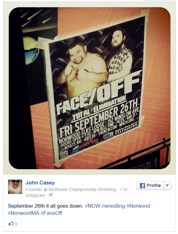 So don’t forget this Friday night at the Norwood Elks Lodge for NCW FACE/OFF: Total Elimination! Doors open at 7:30 with an 8pm bell time. Get your tickets at the door and we’ll see you there!