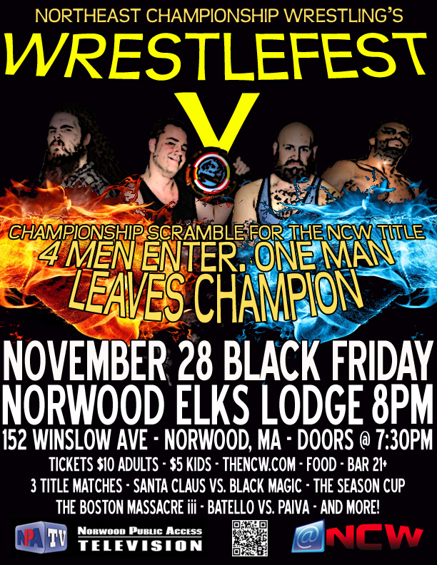 NORWOOD– On Friday night November 28th “Black Friday” comes to Northeast Championship Wrestling when we present the final event of our 2014 Season with NCW WrestleFest X live from the Norwood Lodge of Elks located at 152 Winslow Avenue in Norwood, Massachusetts. Sponsored by our friends at Papa Gino’s Pizza doors open at 7:30 with an 8pm bell time. Tickets will be available at the door $10 for adults and $5 for all kids twelve and under!