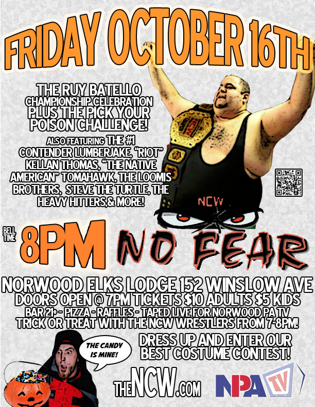 Northeast Championship Wrestling returns to the Norwood Lodge of Elks at 152 Winslow Avenue in Norwood, Mass for our penultimate event of the NCW 2015 Seaso– NO FEAR!