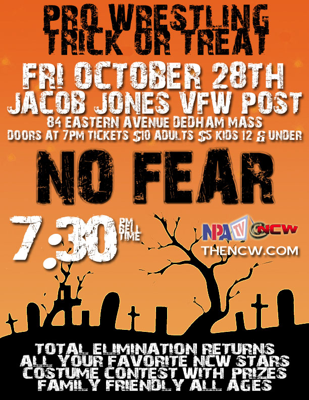 DEDHAM— On Friday night October 28th Northeast Championship Wrestling returns to the Jacob Jones VFW Post 2017 (84 Eastern Avenue) in Dedham, Massachusetts for our annual Halloween Spooktacular NCW NO FEAR! Things kick off at 7pm with trick or treating alongside the NCW wrestlers with the wrestling beginning at 7:30pm. Tickets are available online at http://theNCW.com/tickets and will be available at the door the night of the event $10 for adults and $5 for all kids twelve and under. In addition to the wrestling there will also be a Costume Contest during intermission for the fans to win some great prizes!