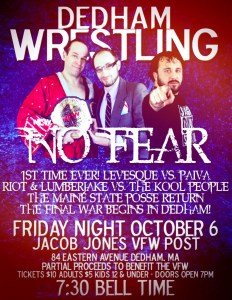 The Jacob Jones VFW Post is located at 84 Eastern Avenue in Dedham, Massachusetts directly behind the Tahiti Restaurant. For more information on Northeast Championship Wrestling please visit theNCW.com, like us on Facebook at www.facebook.com/NCWwrestling, and follow us on Twitter @theNCWtweets.