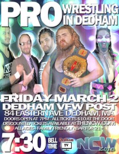 The Jacob Jones VFW Post is located at 84 Eastern Avenue, right behind the Tahiti Restaurant off of Rt. 1 in Dedham, MA. For more information on Northeast Championship Wrestling be sure to like NCW on Facebook at http://facebook.com/NCWwrestling and follow NCW on Twitter @theNCWtweets.