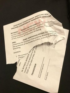 NCW President Dean “The Beast” Livsley came out to the ring to bring out Perry Von Vicious, as PVV demanded an answer from the New England Champion over his offer to purchase the championship from him. Tomahawk shockingly arrived wearing a suit, and seemingly agreed to the sale of his title. Thankfully for Dean and the fans Tomahawk was playing a long con on Vicious, ripping up his contract and ripping off his suit. During the melee Tomahawk was blindsided by Zachary Pierre Beaulieu, looking for his own revenge on the Champ. Livsley then made a Triple Threat Match for the title.