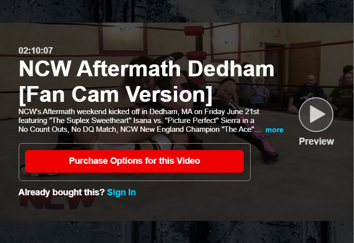 NCW’s 2019 Summer Tour kicked off with Aftermath weekend on Friday night June 21st and Saturday night June 22nd in Dedham, MA and Bristol, RI. Available NOW at NCW UNLIMITED for rental, purchase, or subscription is both awesome events featuring “The Suplex Sweetheart” Isana vs. “Picture Perfect” Sierra in a No Count Outs, No DQ Match, NCW New England Champion “The Ace” Mike Montero defending against “The Masshole” Mike McCarthy, NCW Tag Team Champions The Little Giants colliding with The Perfect Gamble, NCW Heavyweight Champion BRG vs. Osirus, and The Lumberjake battling “The Heavy Hitter” Shay Cash in a Lumberjack Match!