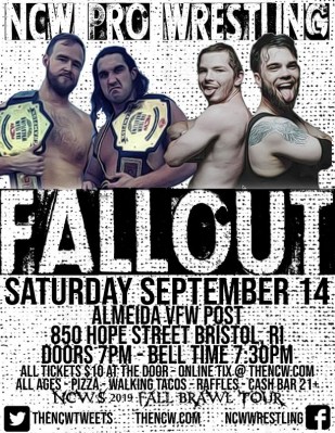 BRISTOL- On Saturday night September 14th Northeast Championship Wrestling continues its Fall Brawl Tour with the second night of a huge weekend of pro wrestling action when we return to the Almeida VFW Post (850 Hope Street) in Bristol, RI for NCW FALLOUT! Doors open at 7pm with a 7:30pm bell time with tickets only $10 at the door where all major credit cards are now accepted. Online tickets can be purchased at theNCW.com/tickets for a discounted price until the day of the event.