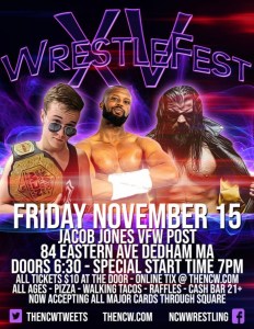 DEDHAM- On Friday November 15th Northeast Championship Wrestling presents the final event of the 2019 Season when NCW returns to the Jacob Jones VFW Post (84 Eastern Avenue) in Dedham, Massachusetts for WrestleFest XV! Doors open at 6:30pm with a SPECIAL 7pm start time with tickets only $10 at the door where all major credit cards are now accepted through Square. Online tickets can also be purchased for a discounted price until the day of the event at theNCW.com/tickets!