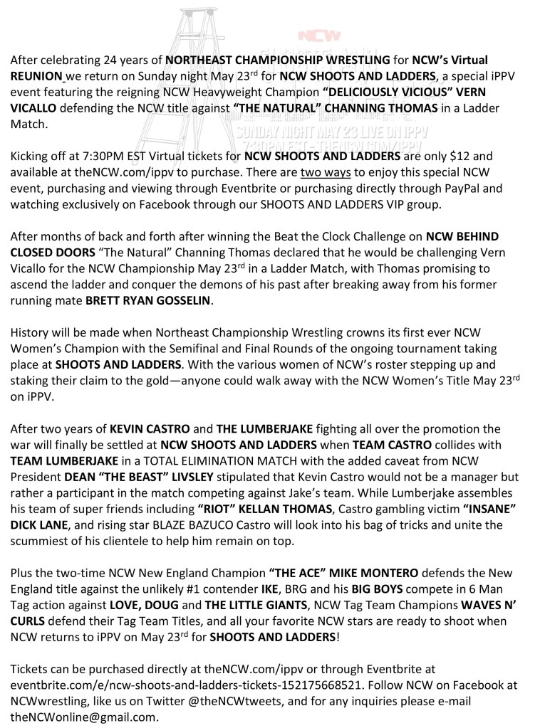 On Sunday night May 23rd Northeast Championship Wrestling returns to iPPV for a huge night of professional wrestling action presenting NCW SHOOTS AND LADDERS, featuring NCW Heavyweight Champion “DELICIOUSLY VICIOUS” VERN VICALLO defending the NCW title against “THE NATURAL” CHANNING THOMAS in a Ladder Match! Please visit theNCW.com/iPPV to get your virtual tickets today!