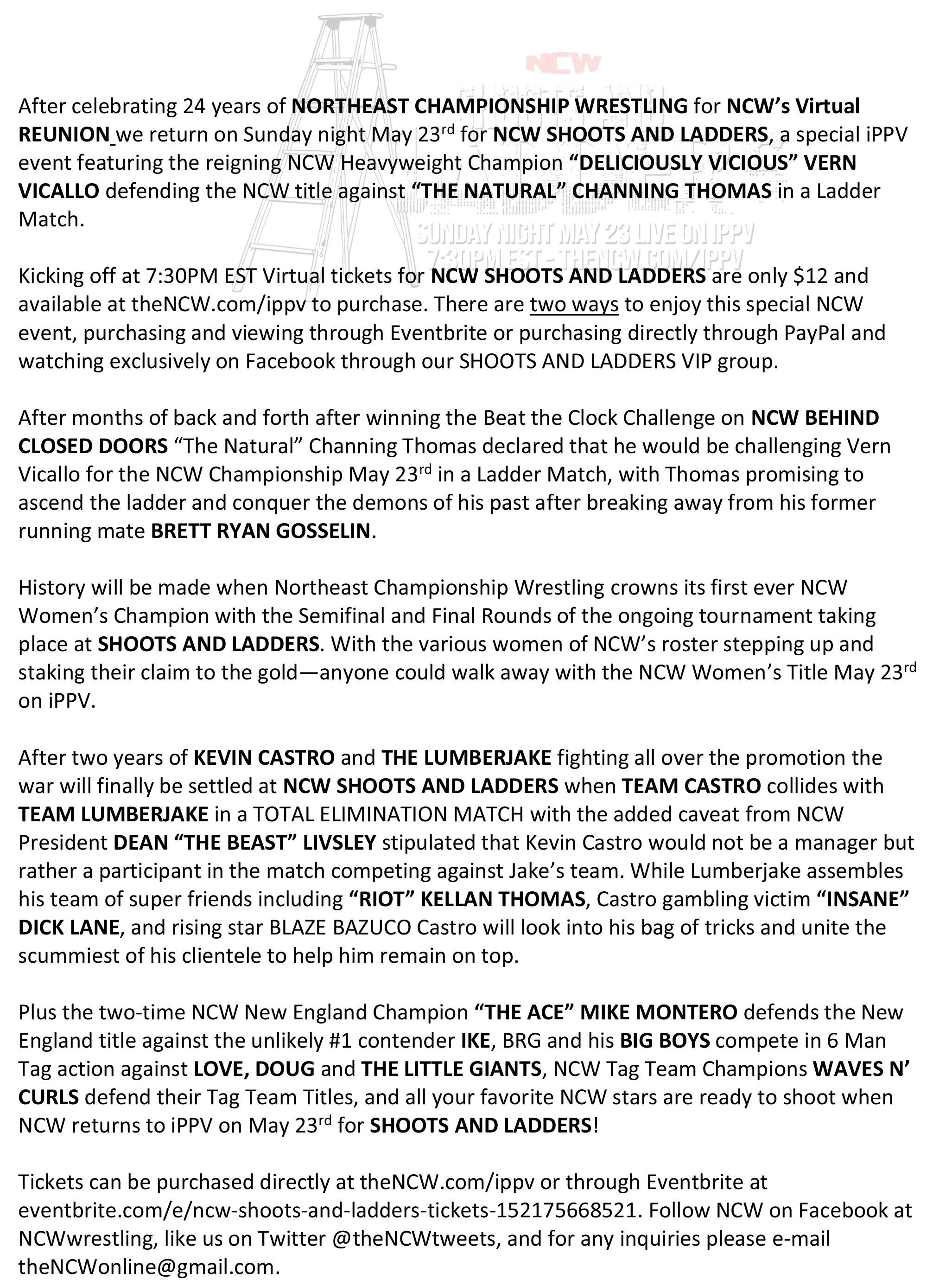 On Sunday night May 23rd Northeast Championship Wrestling returns to iPPV for a huge night of professional wrestling action presenting NCW SHOOTS AND LADDERS, featuring NCW Heavyweight Champion “DELICIOUSLY VICIOUS” VERN VICALLO defending the NCW title against “THE NATURAL” CHANNING THOMAS in a Ladder Match! Please visit theNCW.com/iPPV to get your virtual tickets today!