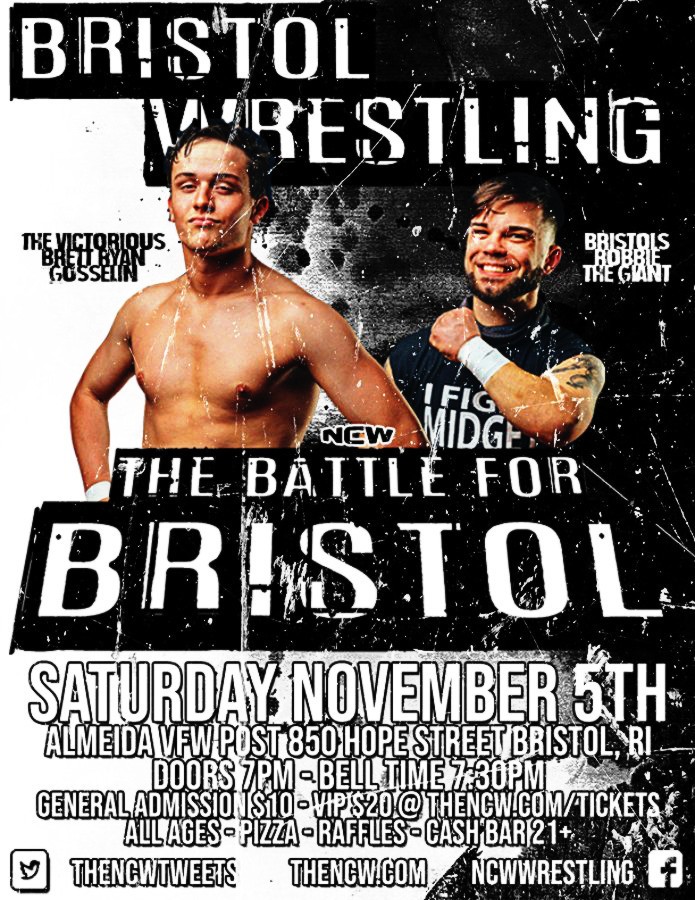 BRISTOL, RI— On Saturday night November 5th Northeast Championship Wrestling and the 2022 Season continues when NCW returns to the Almeida VFW Post in Bristol, Rhode Island (850 Hope Street) with THE BATTLE FOR BRISTOL, an epic night of pro wrestling action headlined by “THE VICTORIOUS” BRETT RYAN GOSSELIN battling hometown hero ROBBIE “THE GIANT” ARAUJO in a Bristol Street Fight with everything on the line!