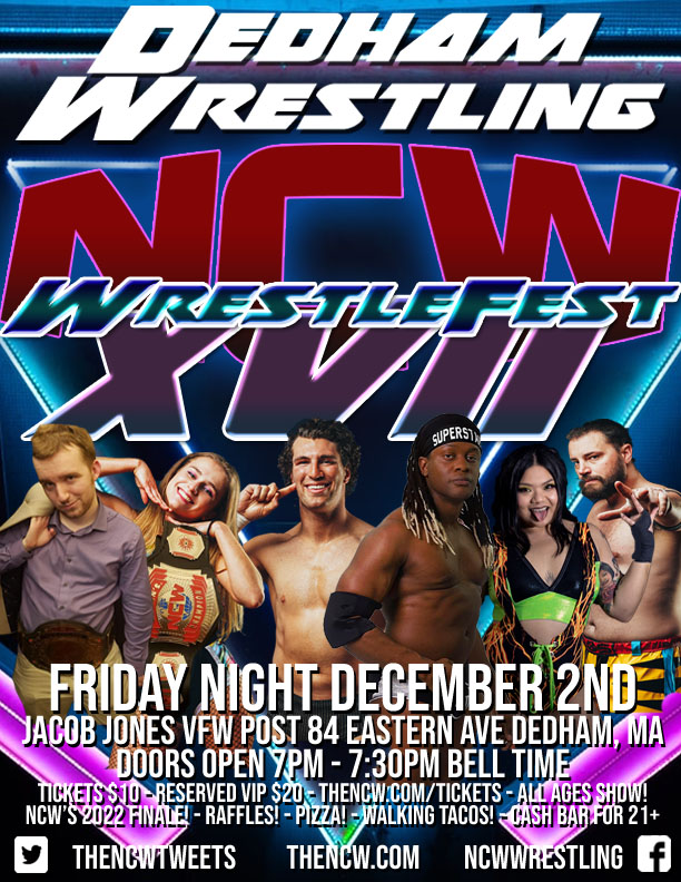 Dedham— On Friday night December 2nd Northeast Championship Wrestling returns to the Jacob Jones VFW Post (84 Eastern Avenue) in Dedham, Massachusetts for NCW’s 2022 Season Finale WrestleFest XVII!