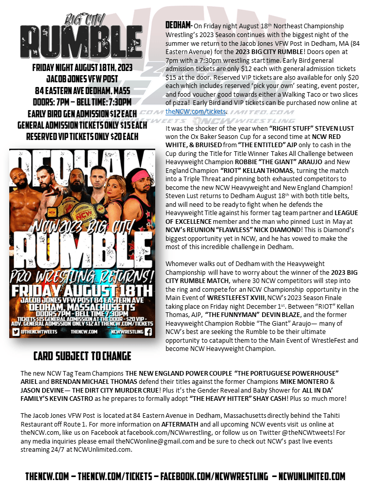 Northeast Championship Wrestling’s 2023 Season continues on Friday night August 18th in Dedham, MA with the 2023 Big City Rumble! Tickets are on sale now at theNCW.com/tickets!