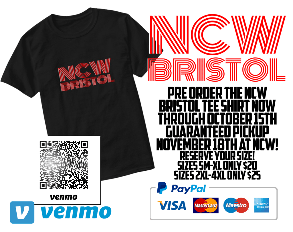small-XL shirts are only $20 and sizes 2XL-4XL are $25. shirts can be purchased through PayPal and Venmo with pickup at NCW Total Elimination November 18th in Bristol!