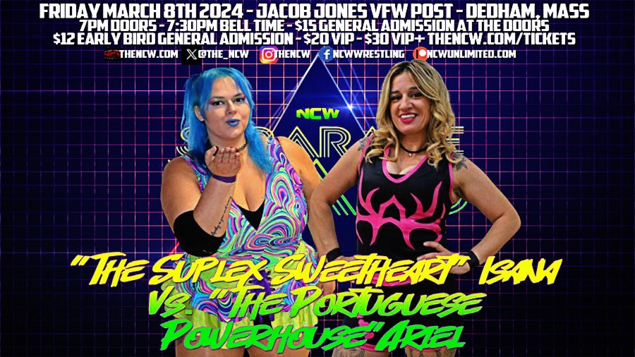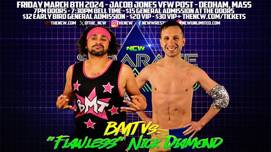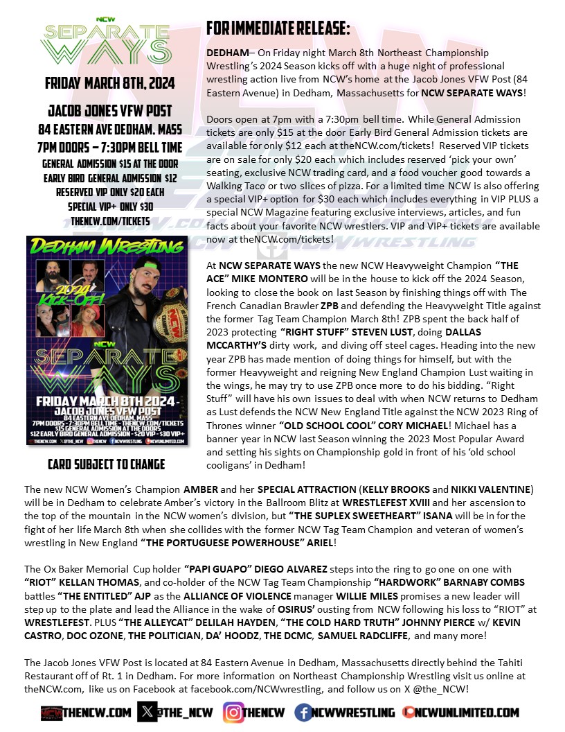 Friday night March 8th Northeast Championship Wrestling’s 2024 Season kicks off in Dedham, Massachusetts with NCW SEPARATE WAYS! GET YOUR TICKETS NOW!