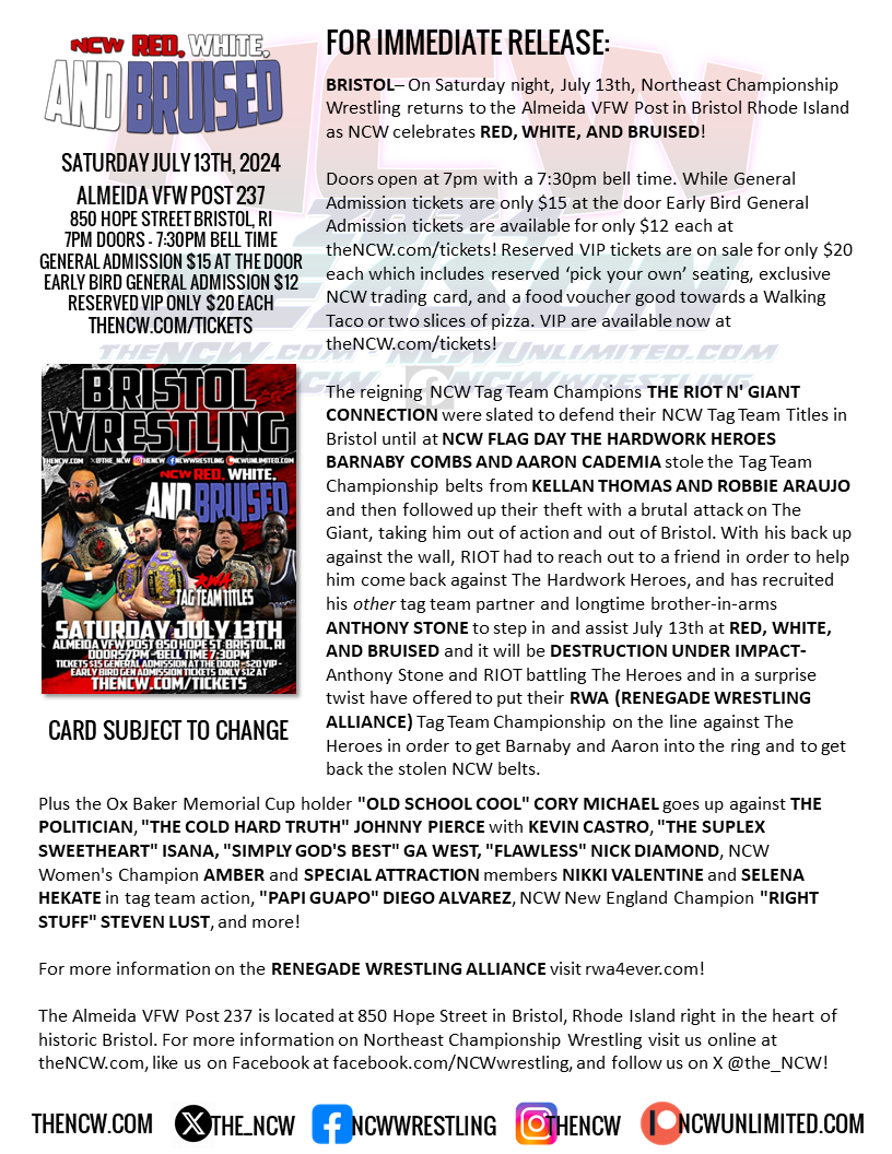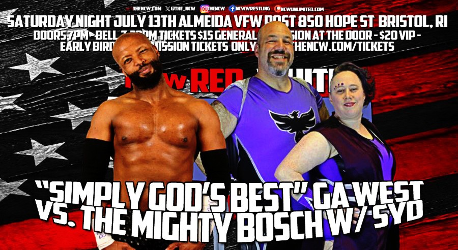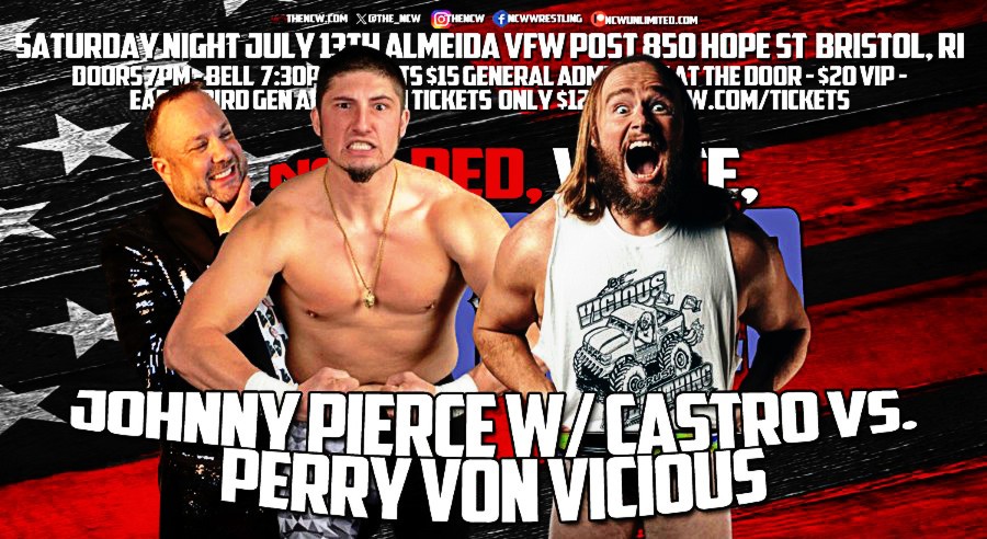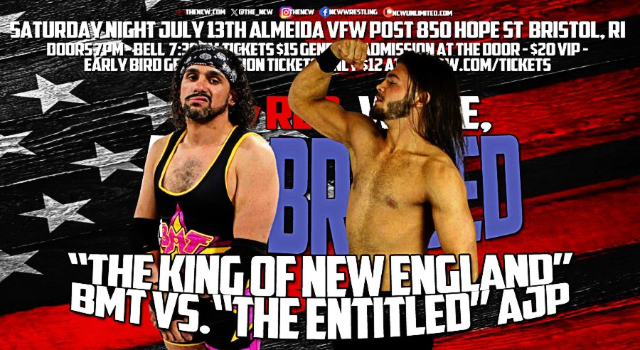 Northeast Championship Wrestling returns to the Almeida VFW Post 237 in Bristol, Rhode Island this Saturday night July 13th! Online tickets are available now at theNCW.com/tickets BUY TICKETS NOW!