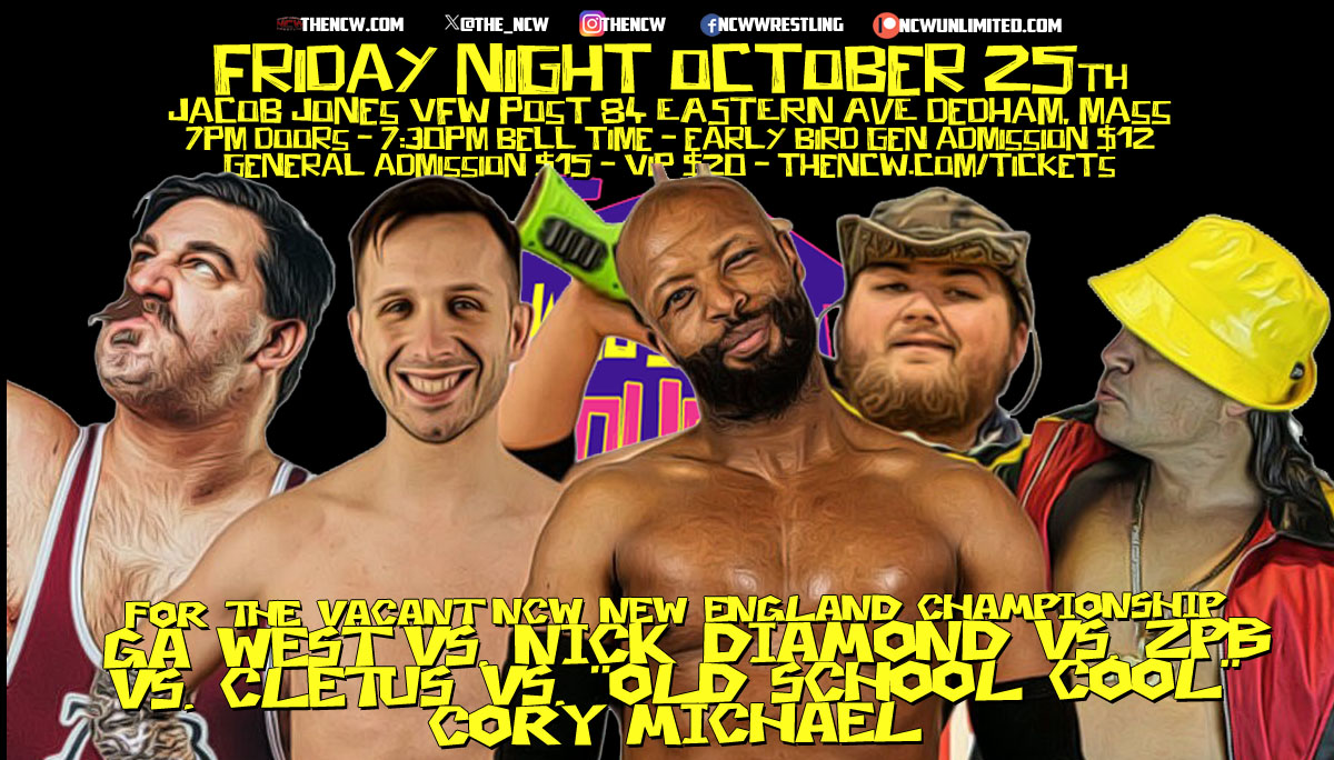 With “OLD SCHOOL COOL” CORY MICHAEL cashing in the Ox Baker Memorial Cup originally against Lust, Michael has agreed to put cash in the Cup and take his chances when NCW returns to Dedham. Also entering the battle for the belt October 25th will be the 2024 Ring of Thrones winner and former New England Champion “SIMPLY GOD’S BEST” GA WEST. With West’s victory in North Attleboro at Kids Day and his pinfall over “THE ENTITLED” AJP during the Six Man Tag at the Big City Rumble, West has assured victory for himself October 25th.