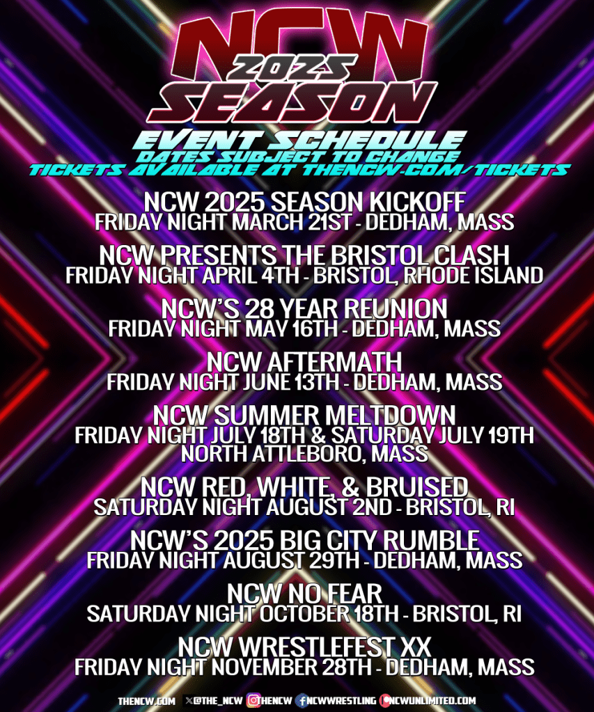 Friday night March 21st Northeast Championship Wrestling’s 2025 Season, celebrating 28 years of NCW kicks off live in our homebase of Dedham, Massachusetts for the 2025 KICKOFF event!