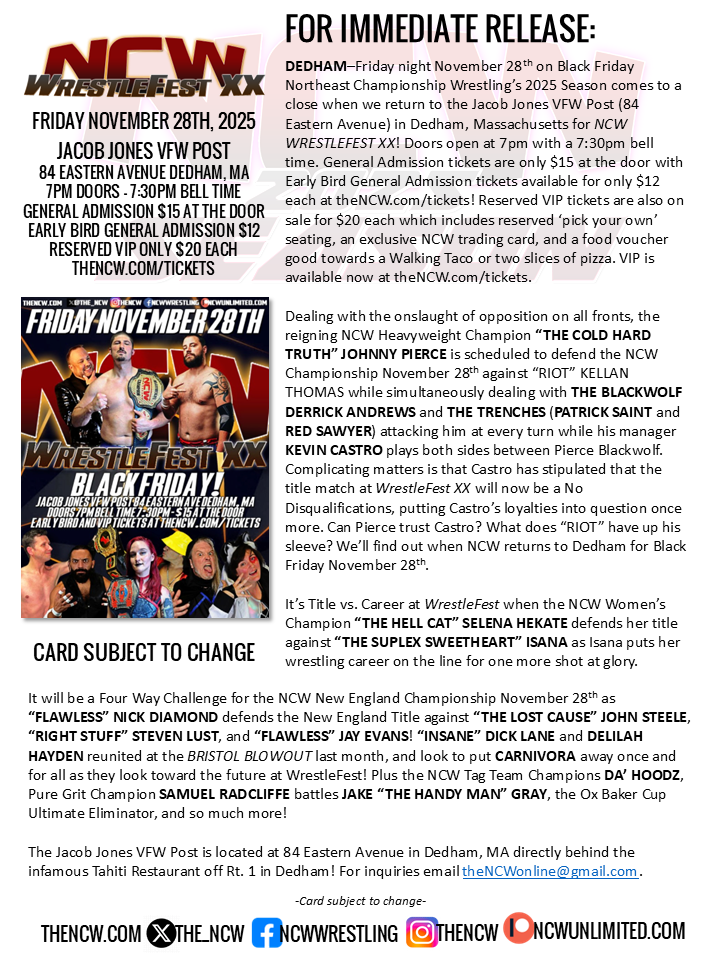 On Friday night November 28th on Black Friday Northeast Championship Wrestling presents our 2025 Season Finale with NCW WrestleFest XX as “THE COLD HARD TRUTH” JOHNNY PIERCE defends the NCW title against “RIOT” KELLAN THOMAS! Tickets are on sale now here!