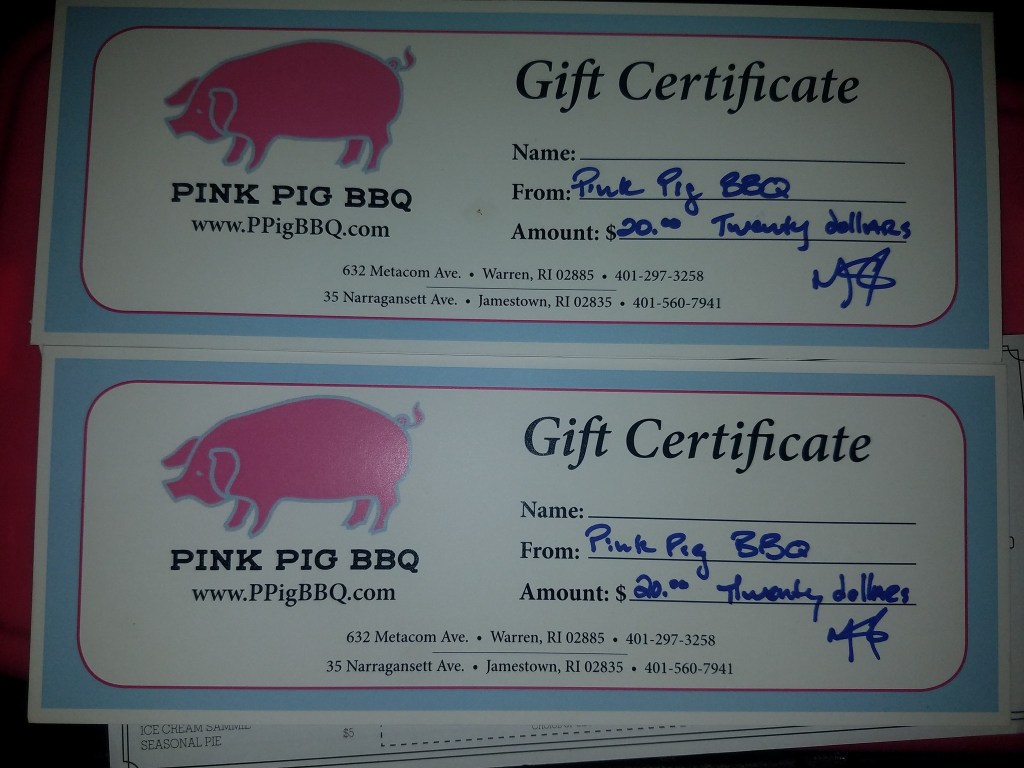 TWO $20 GIFT CERTIFICATES TO PINK PIG BBQ IN WARREN, RI